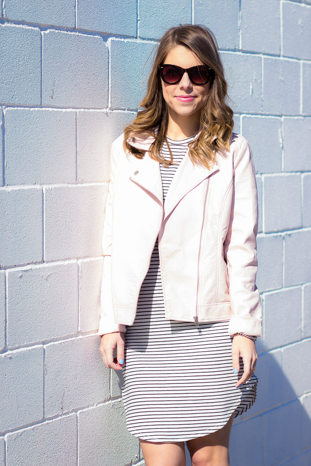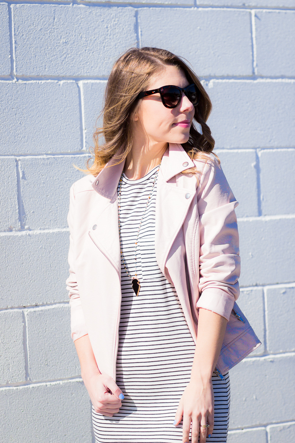 Lose the button down and throw on a moto jacket. I love this light pink one from Forever 21 because of its pretty pastel color and how it looks against black and white. I took off the statement jewelry and added a long chained black onyx arrowhead pendant necklace from Boy Cherie (you can still use code TFHLOVESBC for 20% off your purchase!!). I think the most important and effective way of taking a look from day to night is your shoes. A pair of stappy heeled sandals like these from DSW finish the look and make you ready for an evening out!
