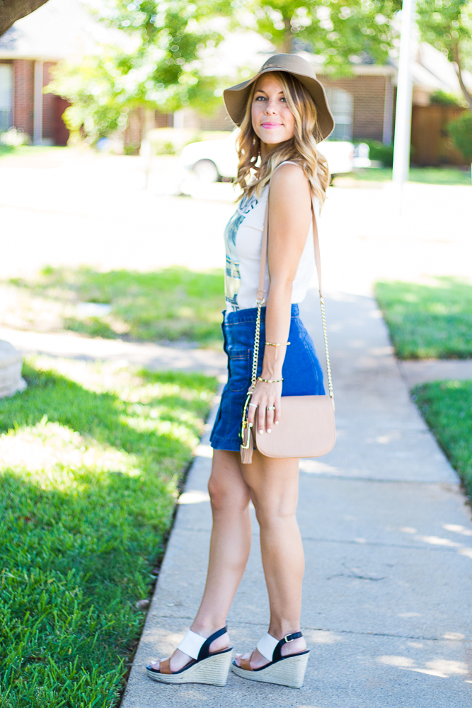 Top: Marshalls // Skirt: Forever 21 // Wedges: c/o Sears // Hat: DSW // Bag: Forever 21