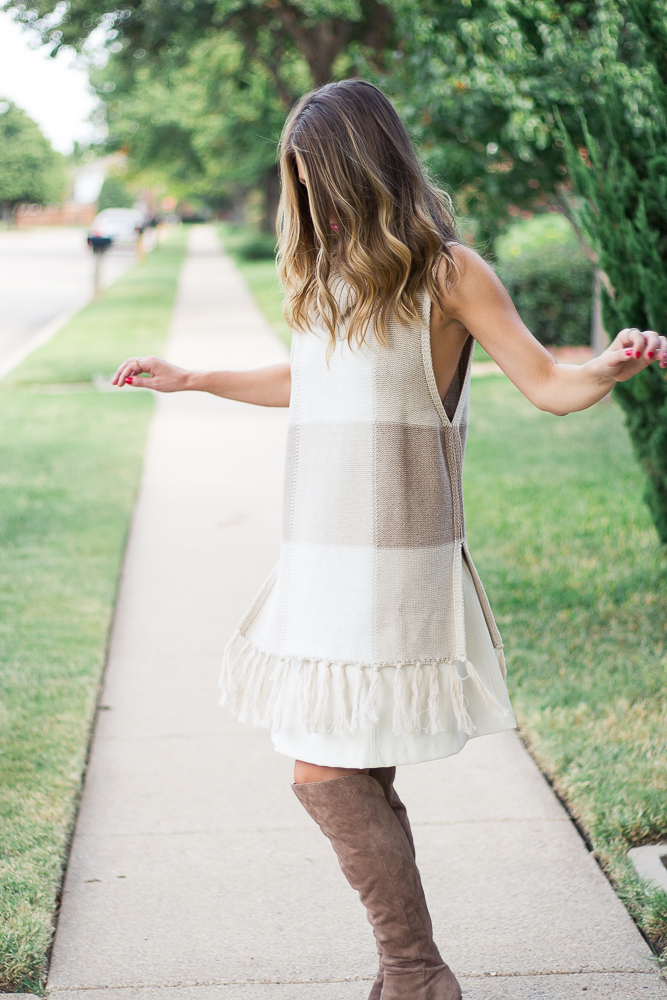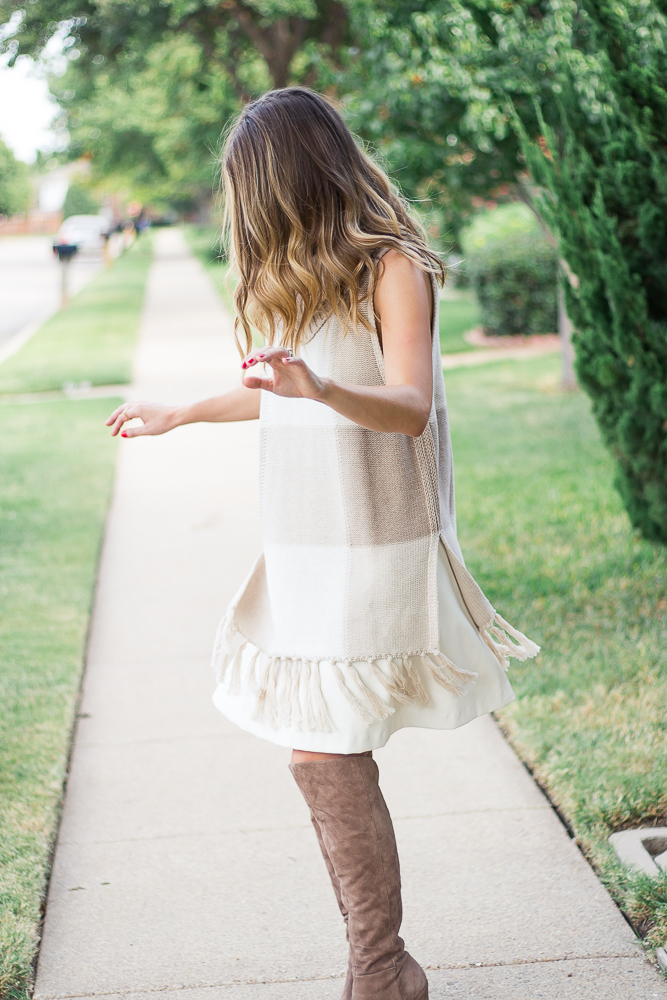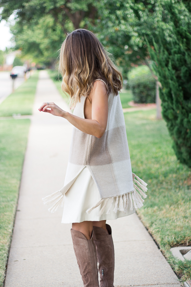 I am in love with this oatmeal plaid Cowl Neck Fringe Sweater from the new Adam Lippes for Target collection. Its oversized silhouette and long fringe trim gives an effortless autumn vibe and the generously sized armholes provide plenty of room to layer up for those colder months ahead. I kept a monochromatic look using only light neutrals that complement the oatmeal tan and fresh ivory colors of the sweater by adding my cream faux leather skirt and tan suede boots. The simplicity of this look allows you to incorporate plaid in a subtle and comfortable way.