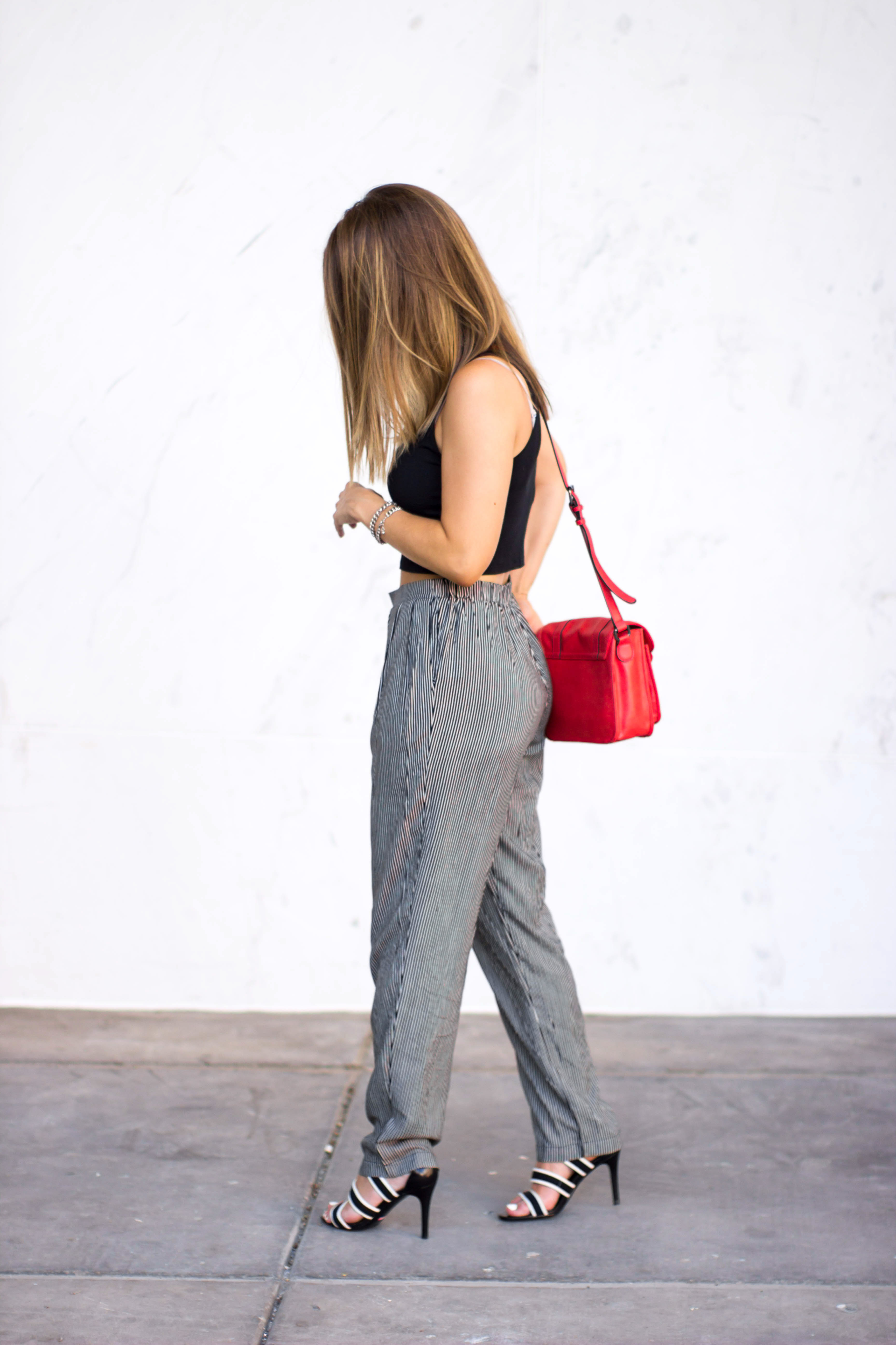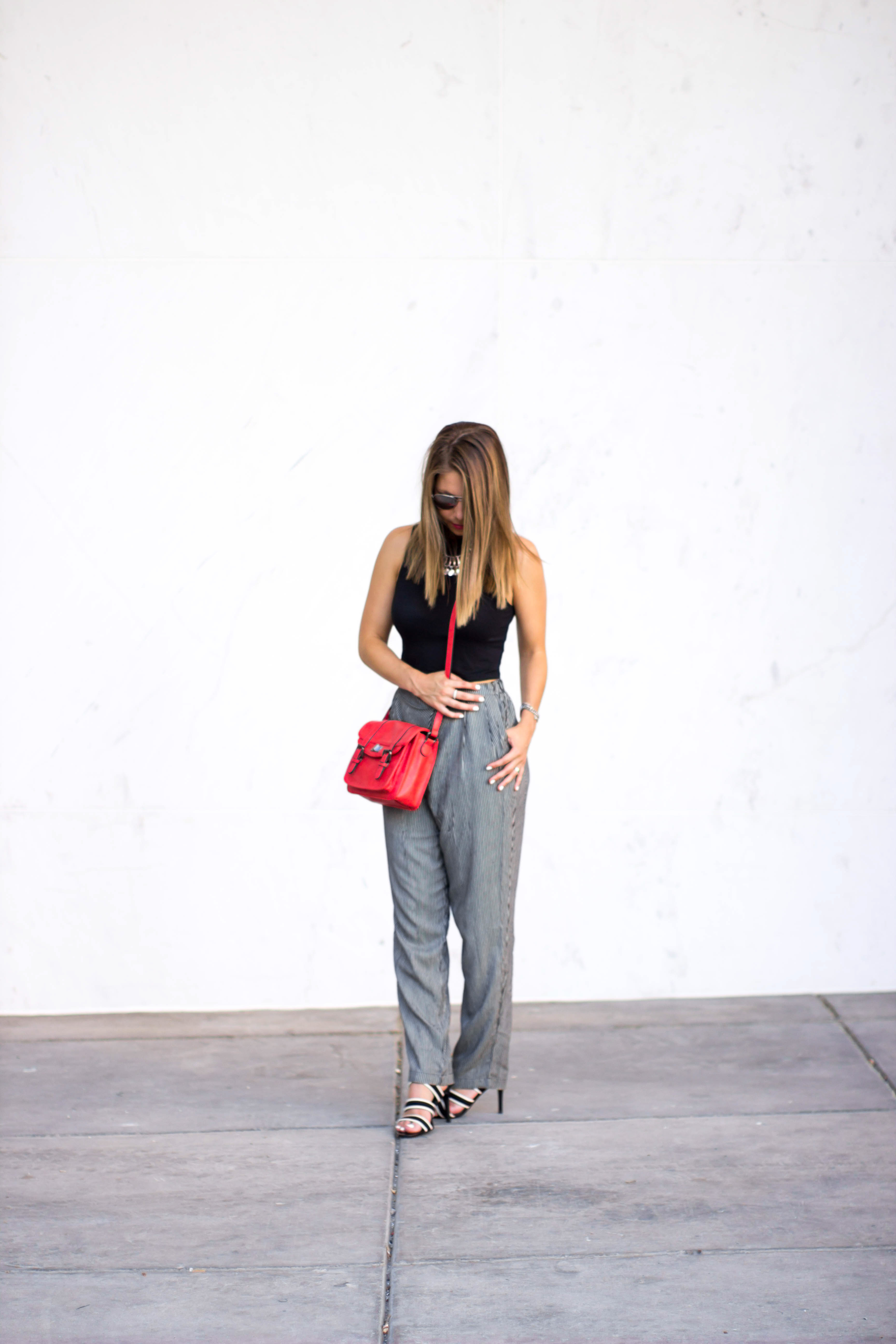 Crop Top: Charlotte Russe (old) // Pants: Nordstrom Rack $22 // Heels: Isaac Mizrahi $45 (purchased at DSW- retail $120) // Purse: c/o Sears // Necklace: c/o Movida Boutique // Bracelet: Forever 21 // Sunglasses: H&MÂ